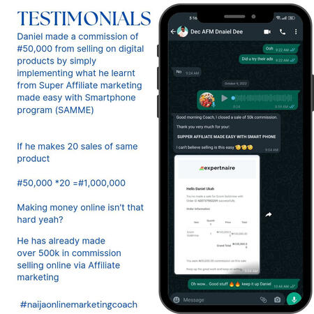 This is worth over ₦35,000☑️ You will also get access to a special training on how to get customers both online and offline. This is worth over ₦15,000☑️ The untold secret of how to build your affiliate marketing business from zero to 8 figures in 12 months. This is priceless but I will leave it at ₦250,000This special program is worth more than ₦970,000Oh! By the way, as a Bonus you will also get⤵️☑️ A lifetime access to inner circle support group where you will keep learning from the wealth of knowledge and experience of the course creator☑️ A special template that shows you how to make at least ₦200,000 in your first 30 days of Affiliate Marketing☑️ Access to monthly strategy sessions where I will be showing you different ways to make money from Affiliate Marketing and several business models.Being in this inner circle group will help you grow and scale up to greater heights in the online space. This is priceless but I'll leave it at 170k☑️ Free access to tools and software that makes your affiliate marketing journey smooth. This is worth over ₦20,000☑️Free access to at least 2 affiliate marketing platforms that can pay you in naira and US dollars and other foreign currencies☑️ Free Access to 2 highest converting sales funnelAll these and more are what you'll be learning from the Super Affiliate Marketing Made Easy with Smartphone programGet all of these for just 20k today